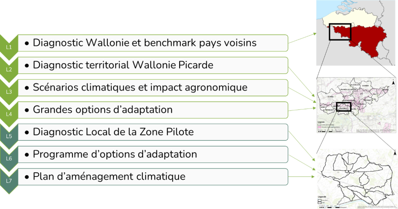 La phase d’étude, réalisée par le consortium, adopte une approche en entonnoir : elle commence par une analyse à large échelle (impact des sécheresses passées en Wallonie et stratégies dans les régions limitrophes), puis se concentre progressivement (sur le Hainaut occidental, et sur une zone pilote spécifique) pour aboutir à des propositions concrètes à tester dans cette zone pilote,